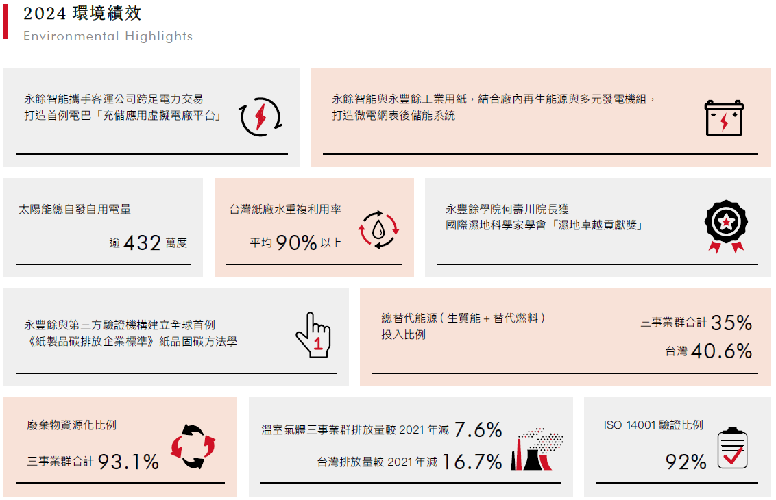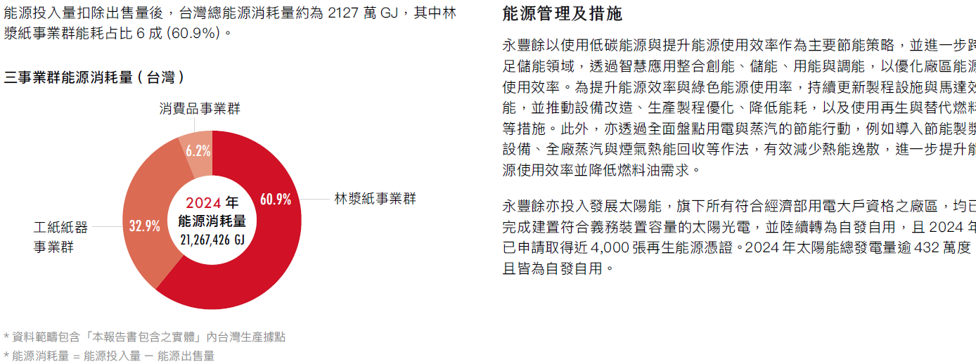 由於環境部將於2025年徵收碳費,永豐餘台灣地區旗下6家應繳納碳費對象之2024年溫室氣體排放量,占台灣溫室氣體總排放量(138.9萬噸二氧化碳當量)約97%,均依規定提送2025年至2030年間自主減量計畫。提案的減碳措施包含: