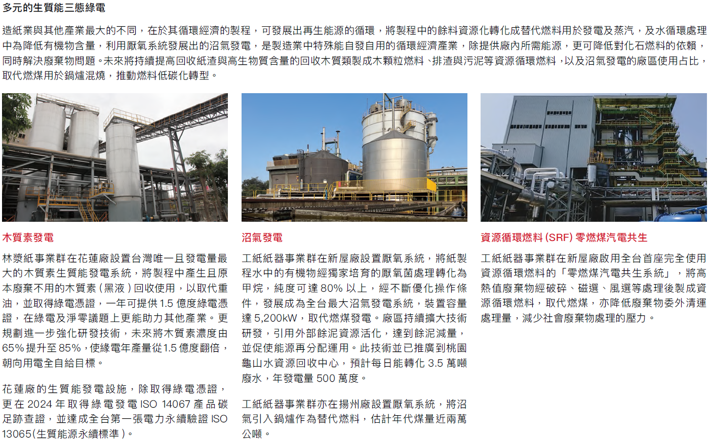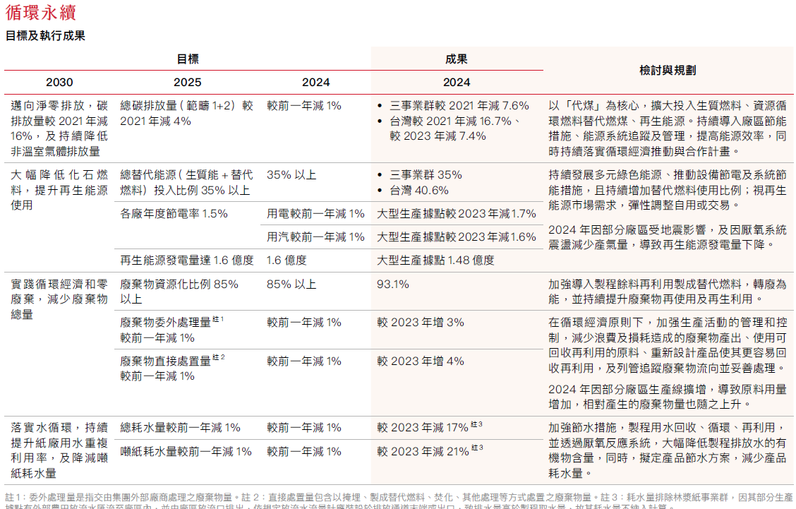 2024年三事業群溫室氣體總排放量較2021年減7.6%,其中範疇一排放量較2023年下降3%,主要減量措施包括鍋爐燃料由重油改用為較低碳排放的天然氣、提升替代燃料及生質能燃料的使用比例、減少煤炭用量,以及新紙機投產提升能源效率,降低單位產品能源消耗;範疇二排放量較2023年下降9.3%,電力排碳係數調降有部分貢獻外,主因仍為能源效率提升導致外購電量減少。