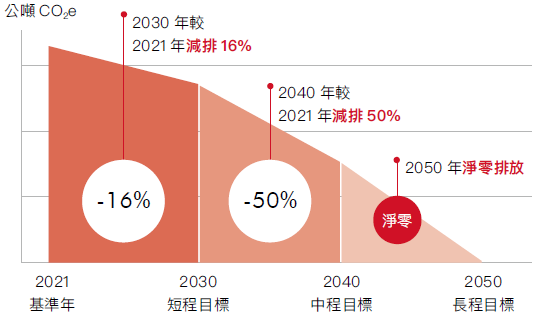 依據碳費徵收對象溫室氣體減量指定目標_公告附表一,基準年為2021年,調整溫室氣體減量路徑,重新訂定基準年。減量路徑參考各廠自主減量計畫目標年承諾值的總和,訂定短程目標為2030年較2021年基準年減量16%,中程目標2040年較基準年減量50%,長程2050年與國家淨零目標切齊。