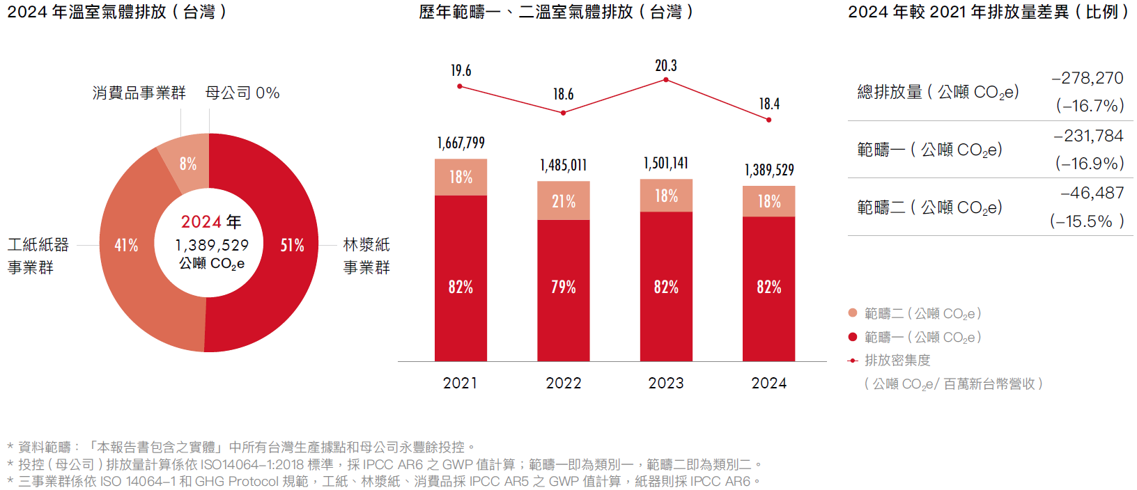 *資料範疇:「本報告書包含之實體」中所有生產據點和母公司永豐餘投控。 *範疇二的區域別排放量與市場別排放量相同。 *排放量計算說明: -方法學:主要依ISO14064-1、GHG Protocol規範,惟揚州廠和鼎豐紙業係依中國國家發展和改革委員會《造紙行業核算指南》規範。 -範疇:統一揭露範疇一和範疇二,其中揚州廠和鼎豐紙業依《造紙行業核算指南》,計算化石燃料燃燒、過程、廢水處理、淨購入電力、淨購入熱力等五項排放量,前三項納入範疇一統計,後兩項納入範疇二。 -GWP值:台灣廠區採IPCC AR5,其中投控(母公司)和台灣紙器廠則採IPCC AR6;大陸廠區採IPCC AR6或《造紙行業核算指南》;越南廠區採IPCC AR6。
