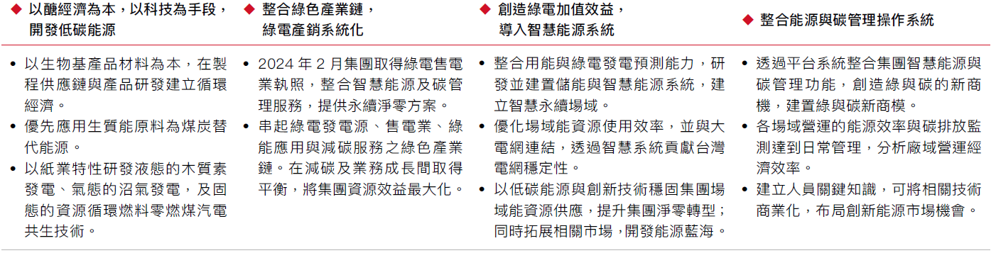 分為「能源結構」、「製程優化」、「轉型研發」3大軸線,「能源結構」以替代燃料「代煤」為核心,提高替代燃料比例、綠電開發以回應國內外脫煤倡議與能源轉型,朝向生產成長與碳排脫鉤的模式前進。「製程優化」持續導入ISO 50001,透過設備改造、系統節能、餘熱回收等措施,除減少能源耗用外,並部署再生能源與儲能設施強化供電穩定。「轉型研發」透過自行開發之碳管理平台,數位化即時監控各工廠碳排放數據,兼顧營運成本及環境保護,並在全球減塑與自然為本理念的趨勢下持續轉型研發,發展材料創新與碳市場參與。