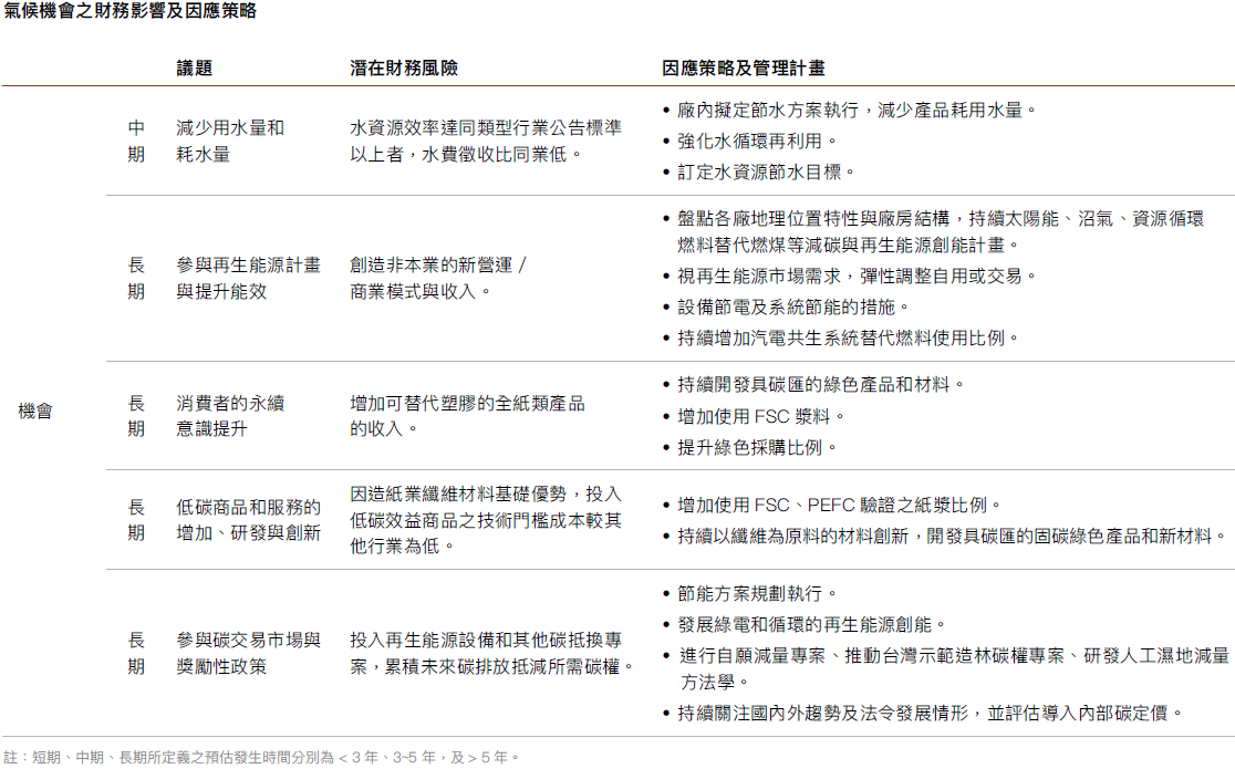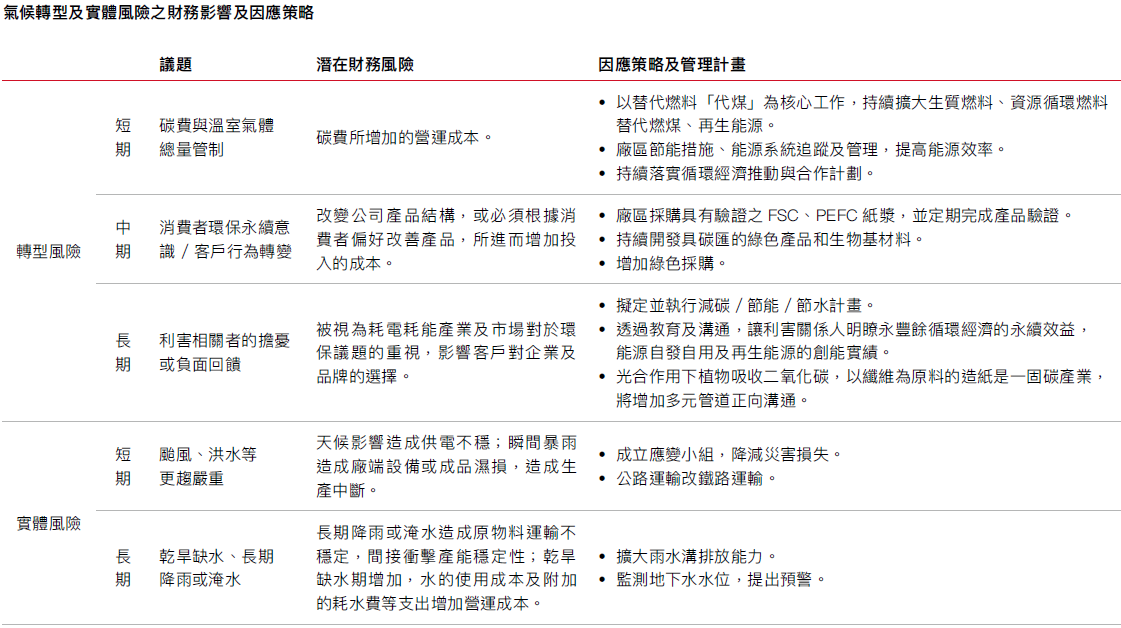 依集團風險管理流程,每年定期檢討風險鑑別。2024年鑑別結果維持前一年度的議題清單,共計三項轉型風險、兩項實體風險,及五項機會。我們依循聯合國永續發展目標永續消費及責任生產模式的指引,訂定循環永續是為永豐餘重要的永續策略,以農林業副產品為原料,不斷循環再生,生產可再生的紙及材料產品,促進綠色經濟,同時發展再生能源、水資源管理、碳管理等作為氣候因應行動。據此,我們評估此十大風險與機會可能造成之短、中、長期財務影響,並發展因應策略與管理計畫,如下頁表列。