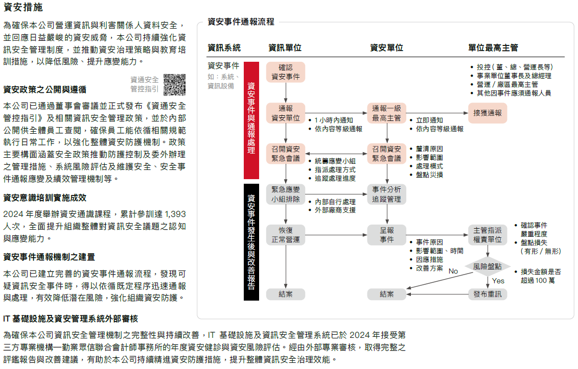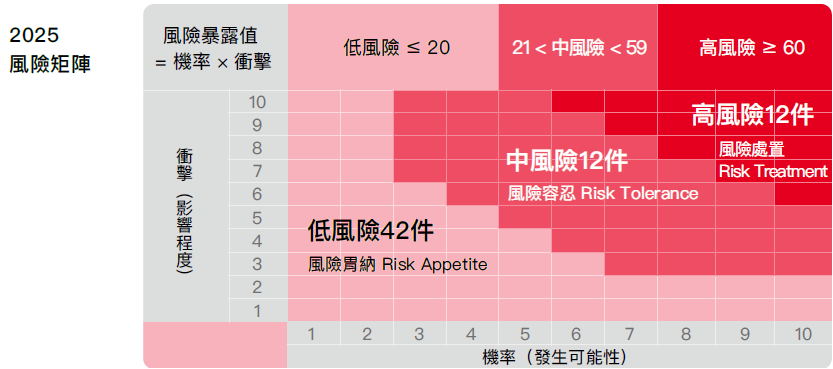 本公司亦定期向董事會報告,已於2024 年11 月13 日向董 事會報告風險管理組織架構、風險管理程序及其運作情形。 我們將持續提出、執行與修正風險管理對策,並追蹤管理狀 態。風險管理政策與程序運作情形詳2024 年報P.66、P.67。