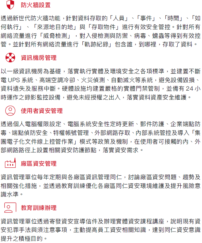 本公司資安風險策略主軸聚焦於科技運用與資安治理,資訊安全風險管理係透過資訊專業管理及技術服務平台,以確保本公司及各集團公司的專業權責分工、技術支援到位、控管機制明晰。